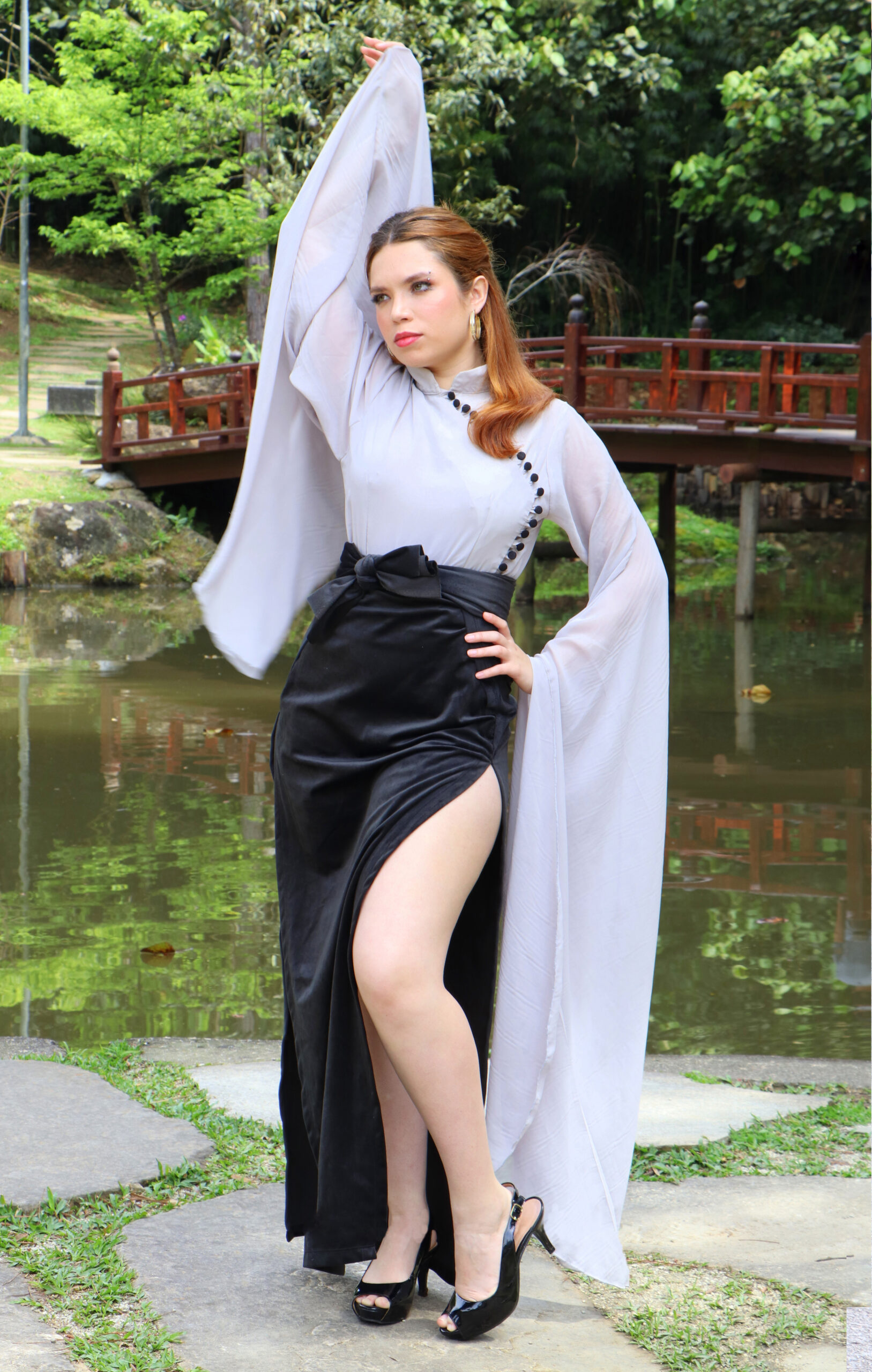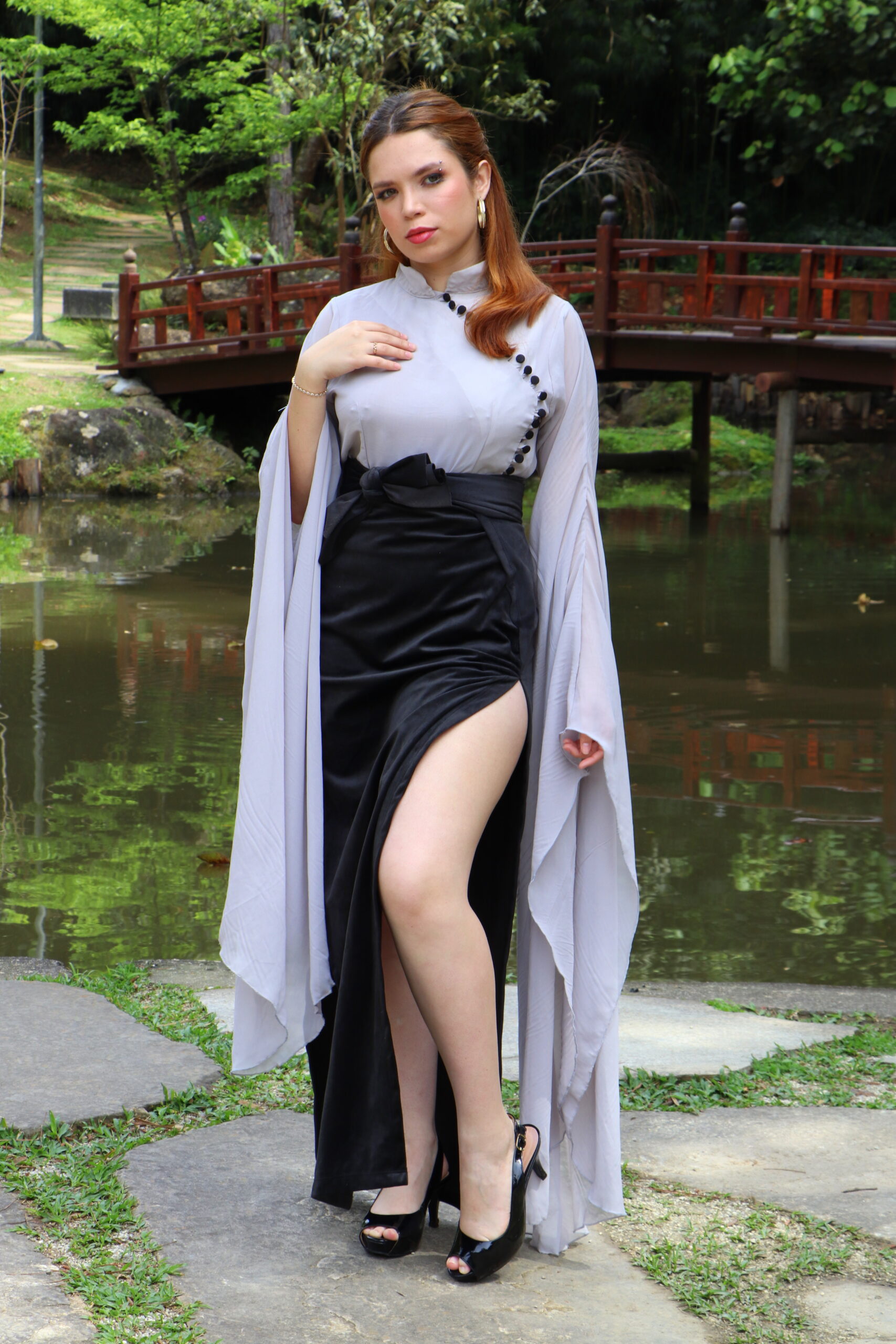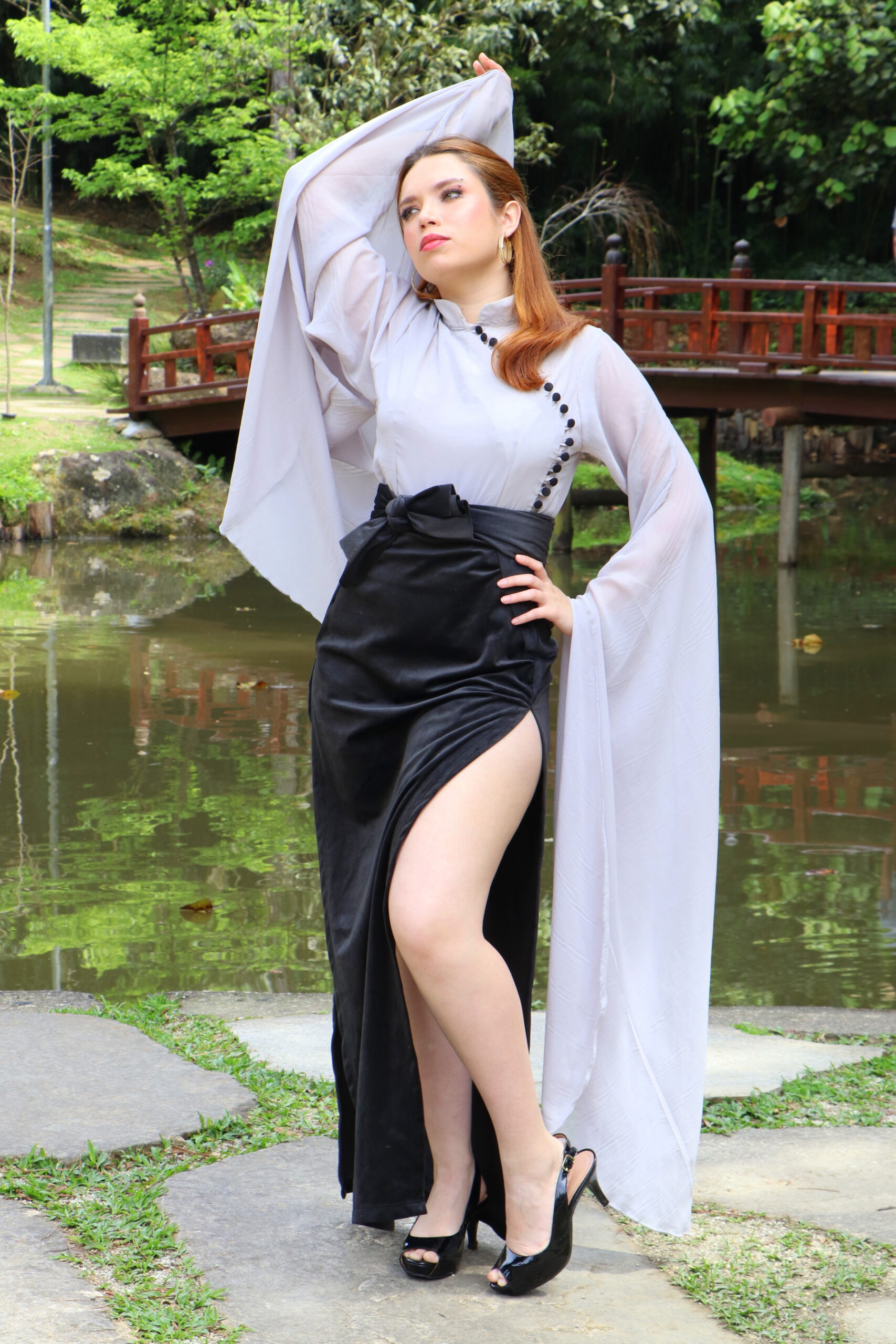 Conjunto sofisticado com blusa em chiffon leve e fluido, com design diferenciado: mangas longas que se estendem até quase o chão e 20 delicados botões frontais. Acompanha um par de braceletes de tecido no mesmo tom, pensados para valorizar os punhos e criar composições versáteis.